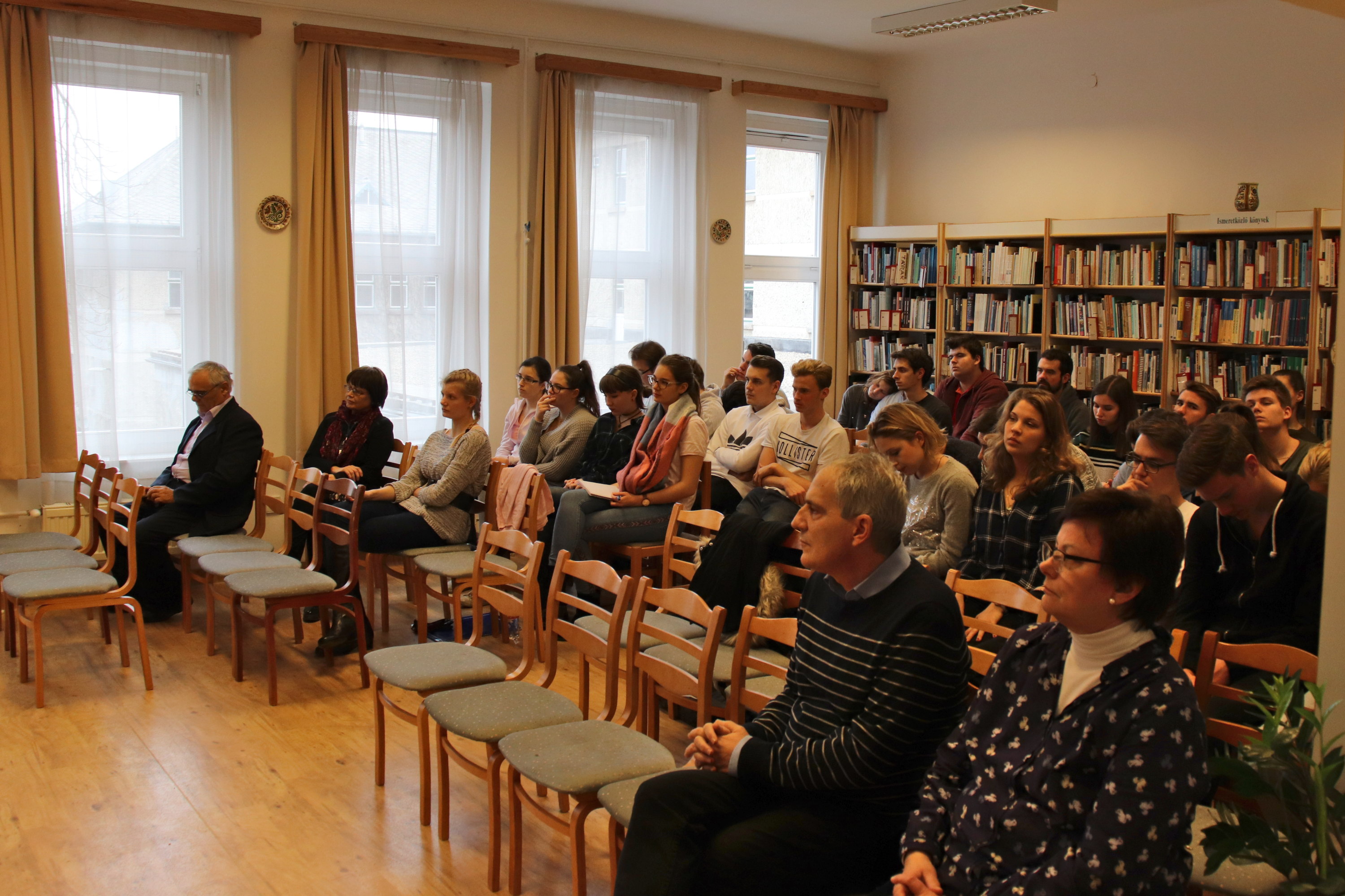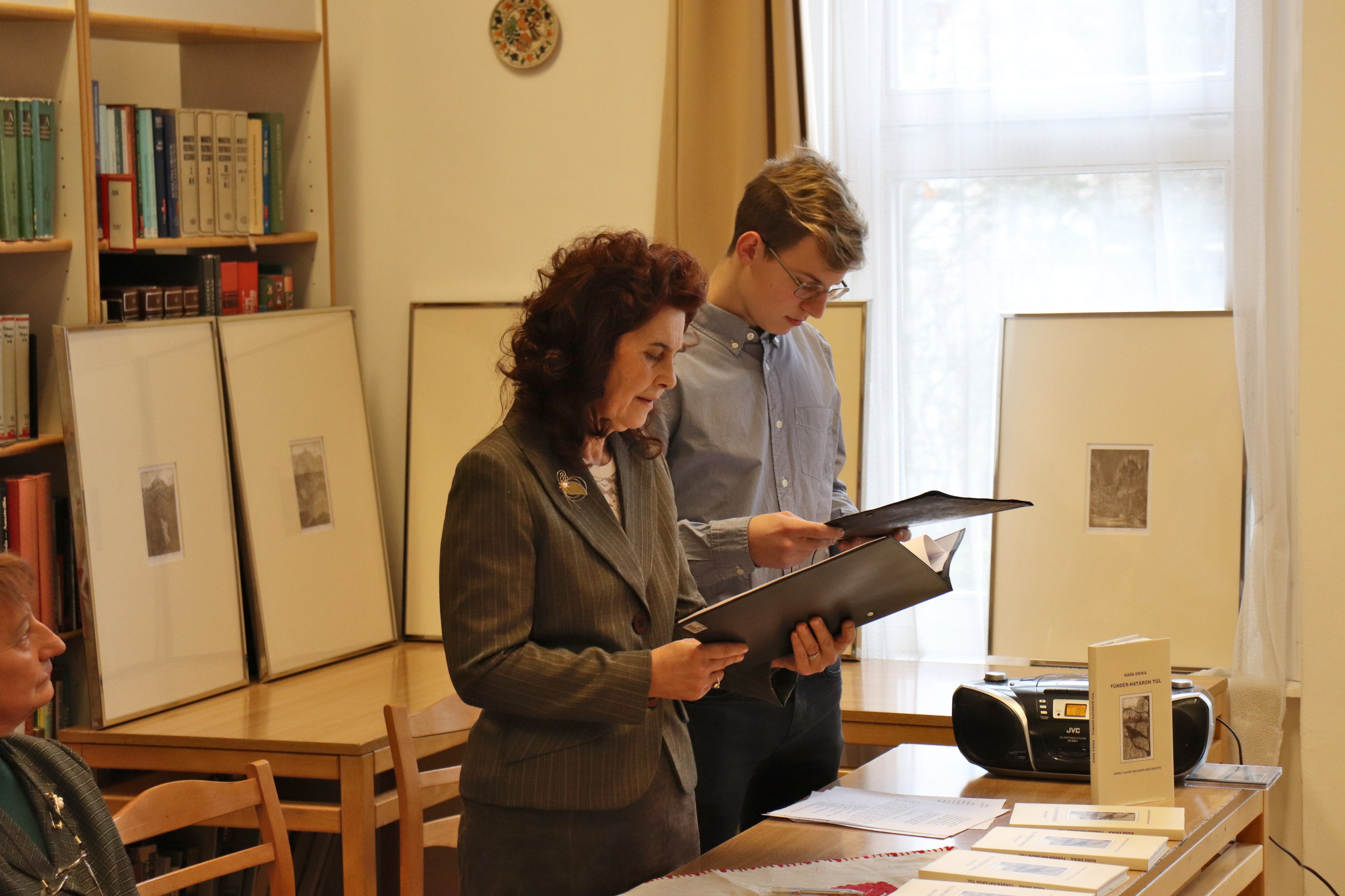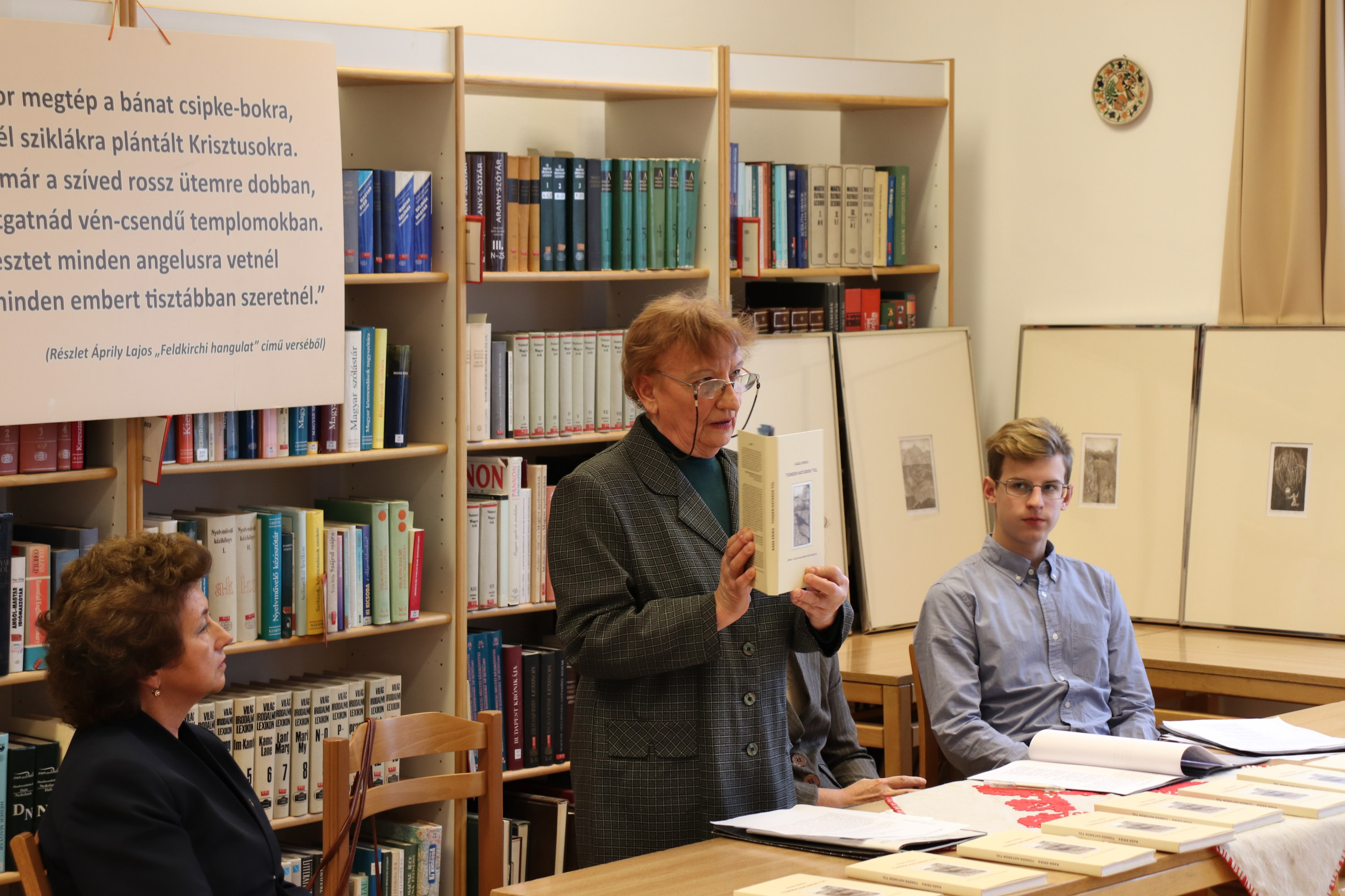December 7-én két végzős osztály (a 12. b és d) rendhagyó irodalomórán vett rész. Az eseménynek a könyvtár adott helyet. Mivel a megidézett költő egykor iskolánk igazgatója volt (1934-1942), érezni lehetett mind az előadók, mind a résztvevők elfogódottságát. Az elmúlt évben Áprily Lajos születésének 130. és halálának 50. évfordulójára emlékeztünk. A költő előtt tisztelegve jelent meg Kada Erika „TÜNDÉR-HATÁRON TÚL” című tanulmánykötete, mely Áprily Lajos vallásos költészetét mutatja be. A téma feldolgozása irodalomtörténeti szempontból is régi hiányt pótol: a költő istenes verseinek elemzése önálló kötetben korábban még nem jelent meg. A szerző ezt mutatta be, Áprily-idézeteket olvasott fel Radics Péter, Kazinczy-díjas diák, majd a Magyar Irodalomtörténeti Társaság részéről Bajtai Mária méltatta a kiadványt, végül a könyv illusztrátora, Bella Rózsa fűzött magyarázatokat a kötetbe helyezett és kiállított rézkarcokhoz.
