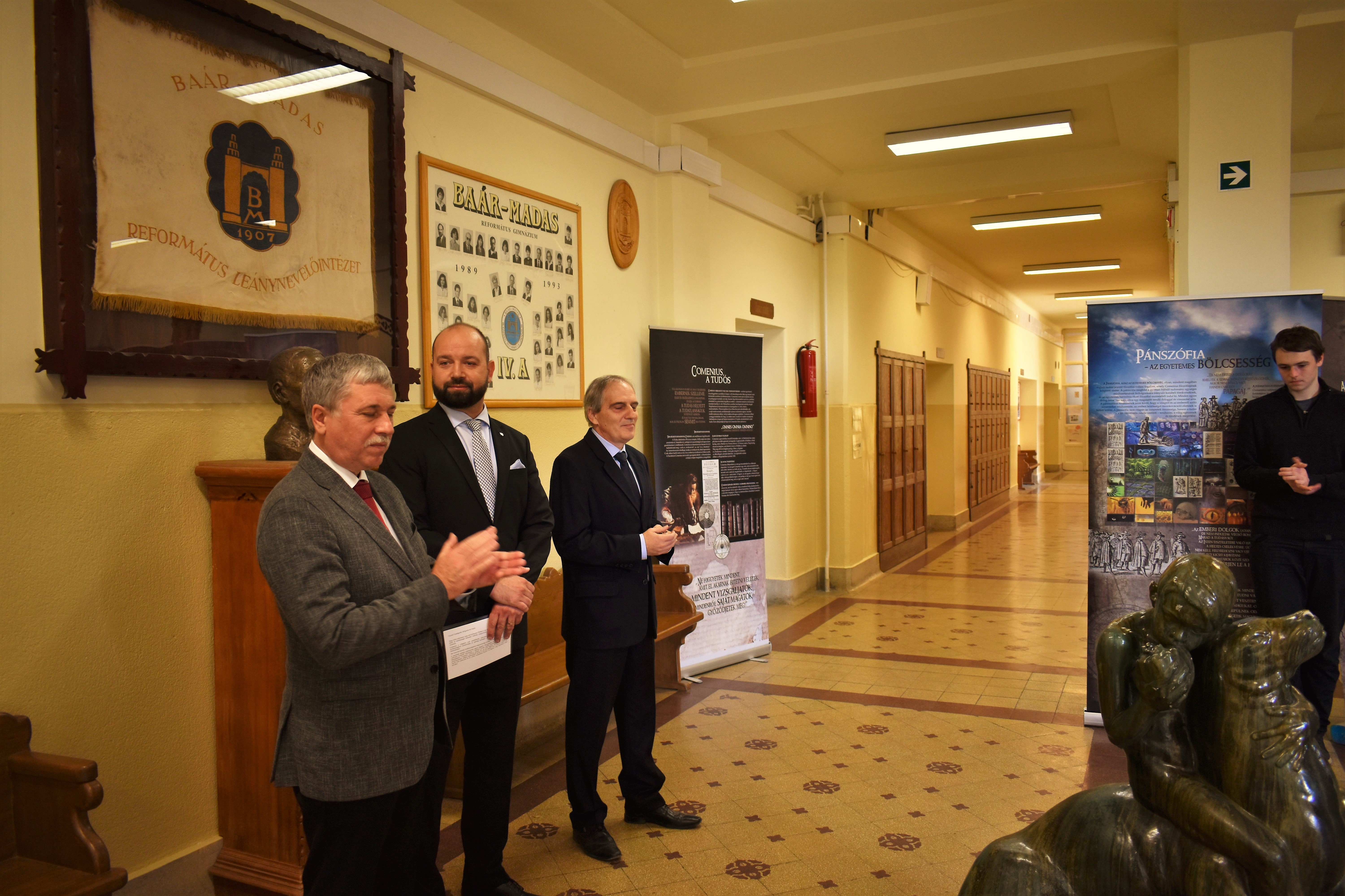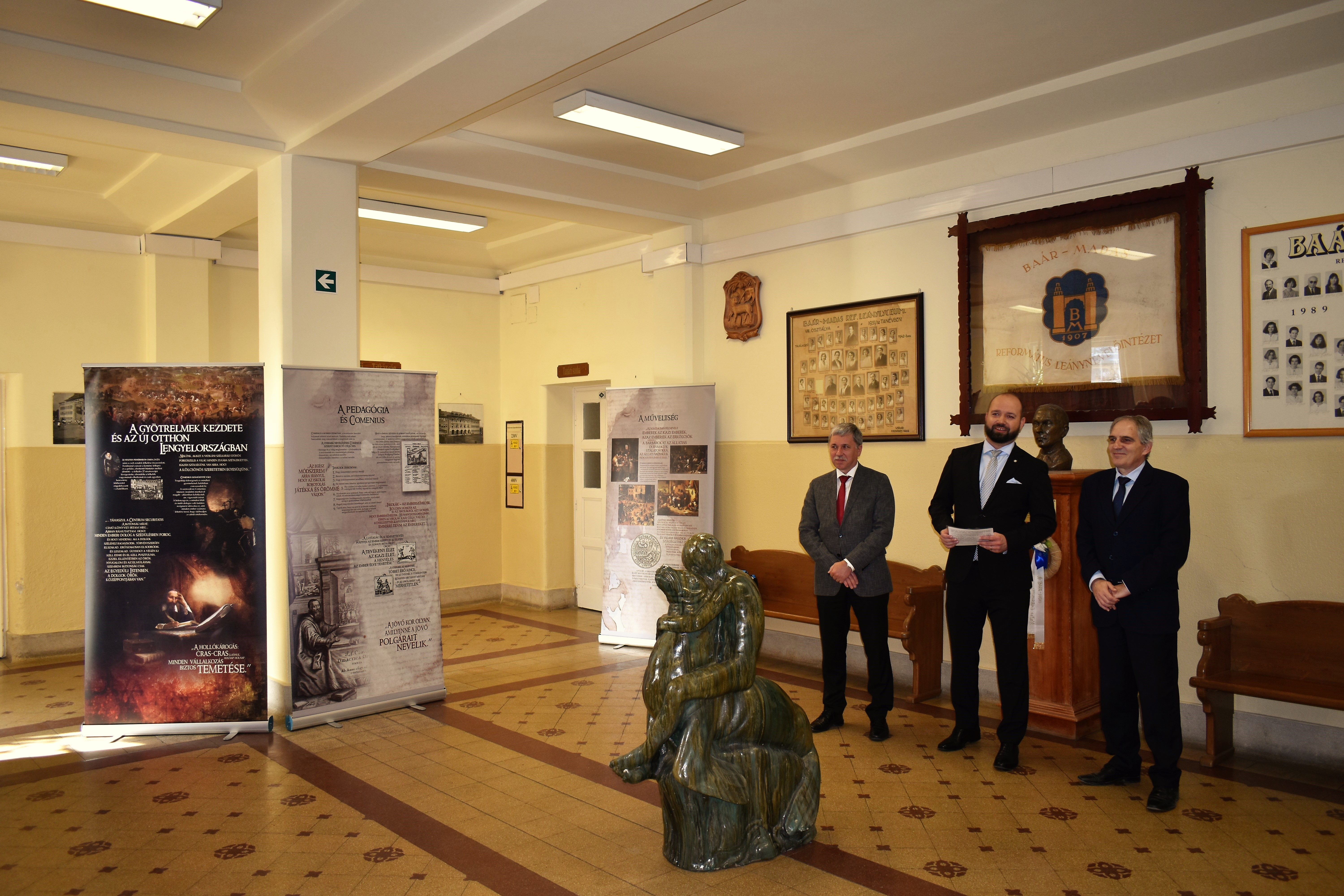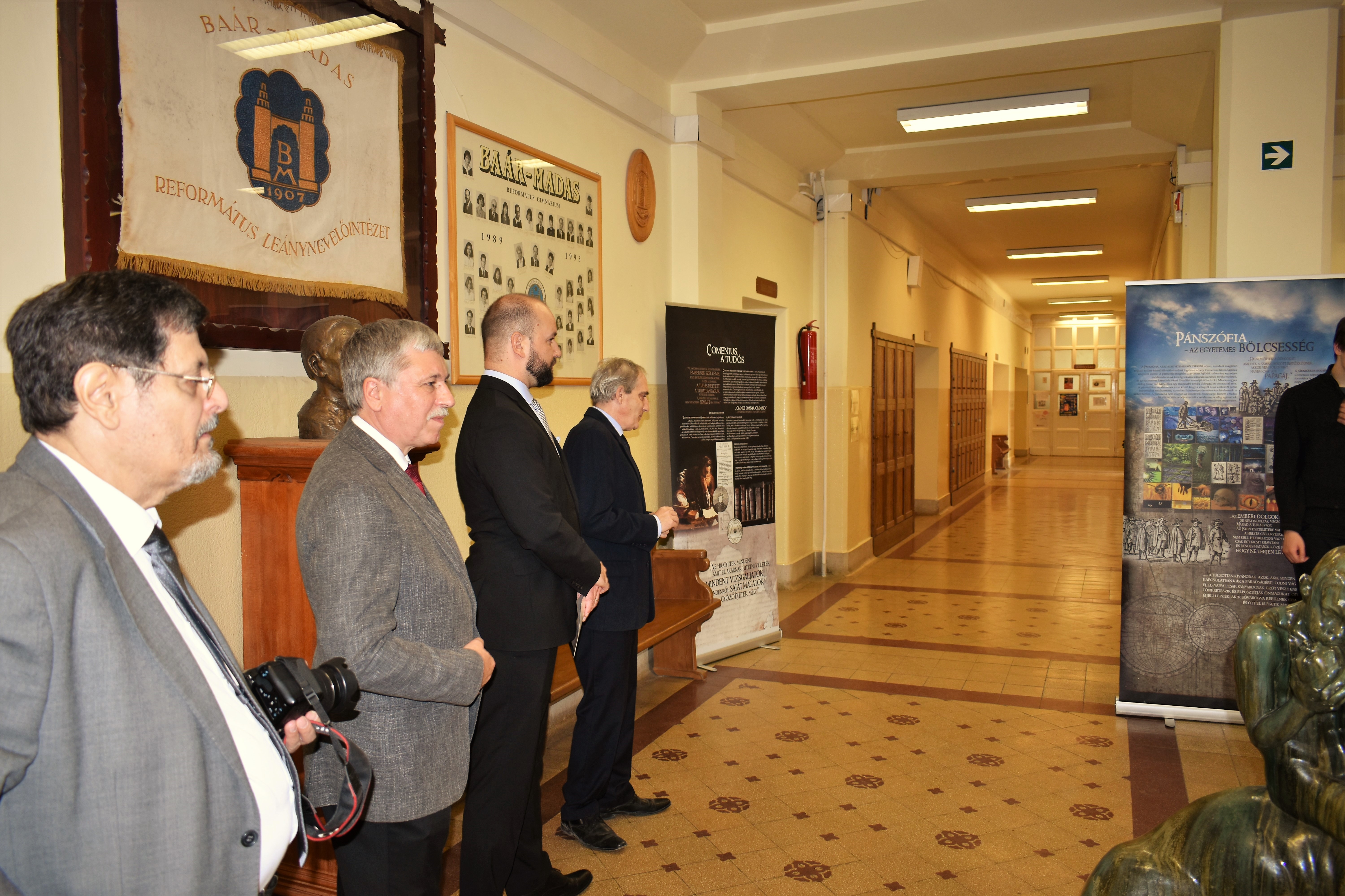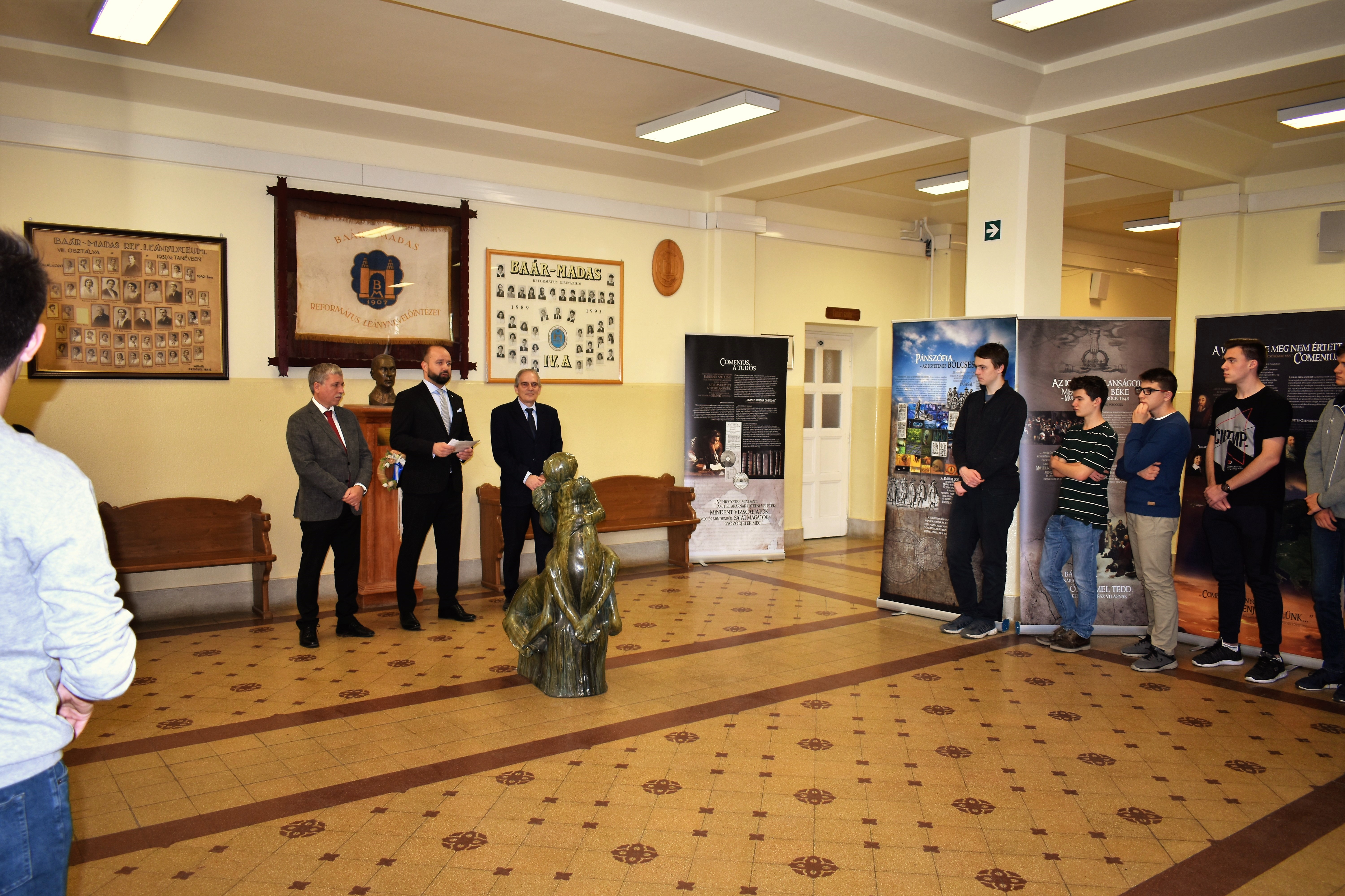 „Képzeld el, ma találkoztam a cseh nagykövettel!” – október 14-én a Baár-Madas diákjai közül többen ezzel a hírrel érkezhettek haza otthonukba. S nem is túloztak! Ugyanis a fent említett napon iskolánkba látogatott a Cseh Köztársaság magyarországi nagykövete, Bial Tibor, hogy megnyissa azt a kiállítást, amelyet Jan Amos Komensky (Comenius Ámos János), a XVII. századi zseniális cseh-morva pedagógus tiszteletére – emlékére rendeztek meg. A Nagykövet úr méltatta Comenius nagyságát, pedagógiai újításait, utalt kalandos életútjára; s arra biztatta a megjelenteket, hogy gondosan tekintsék át a kiállítás anyagát. Külön felhívta a figyelmünket a nagyszerű pedagógusnak 1650-54 közötti életszakaszára, amikor I. Rákóczi György erdélyi fejedelem özvegyének Lorántffy Zsuzsannának a meghívására Sárospatakon munkálkodott.